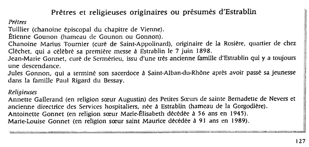 Revenons à des informations données à la page 127 de ce livre et concernant les prêtres et religieuses originaires ou présumés d’Estrablin (voir extrait ci-dessous)