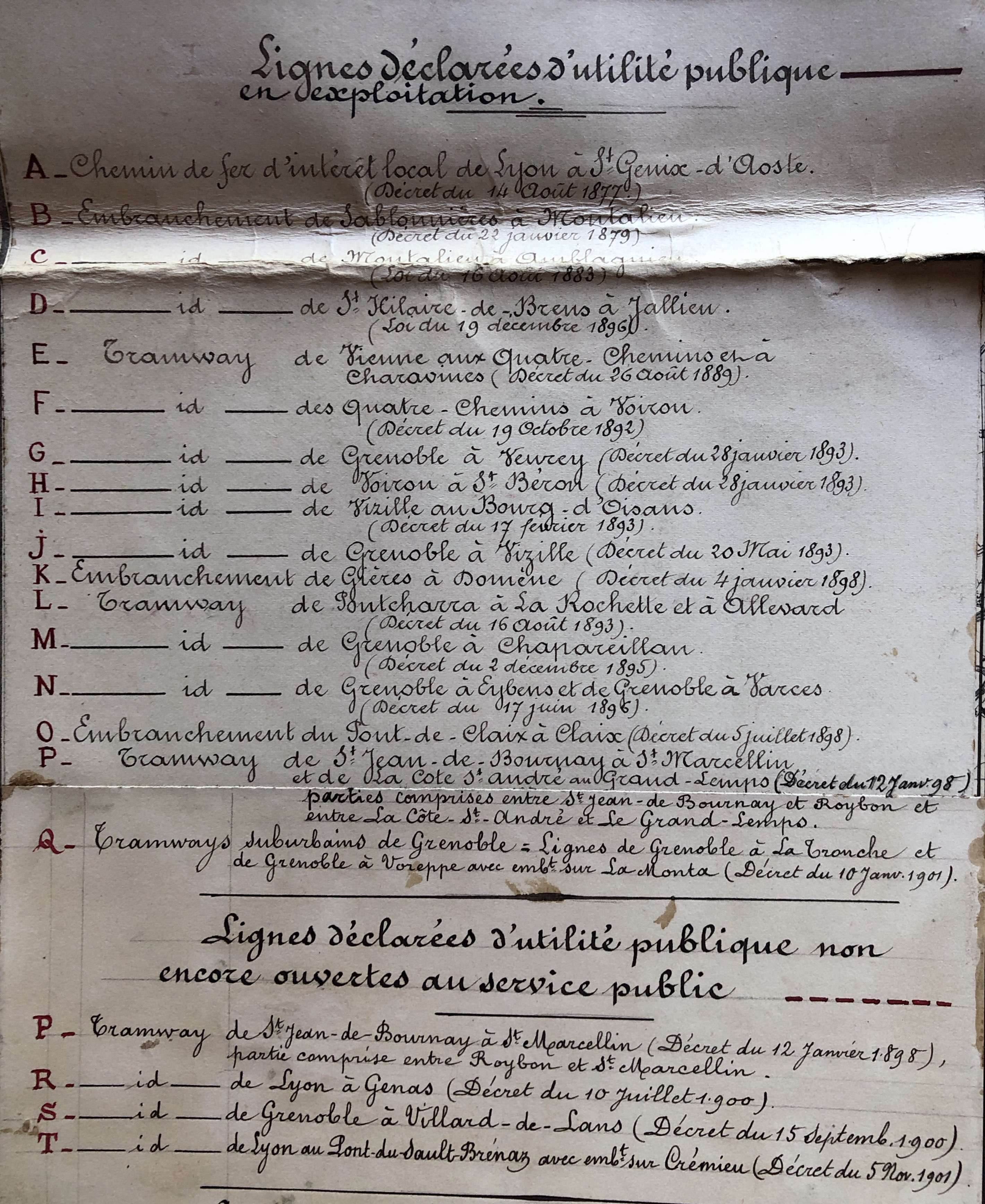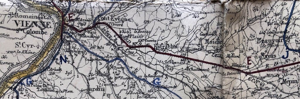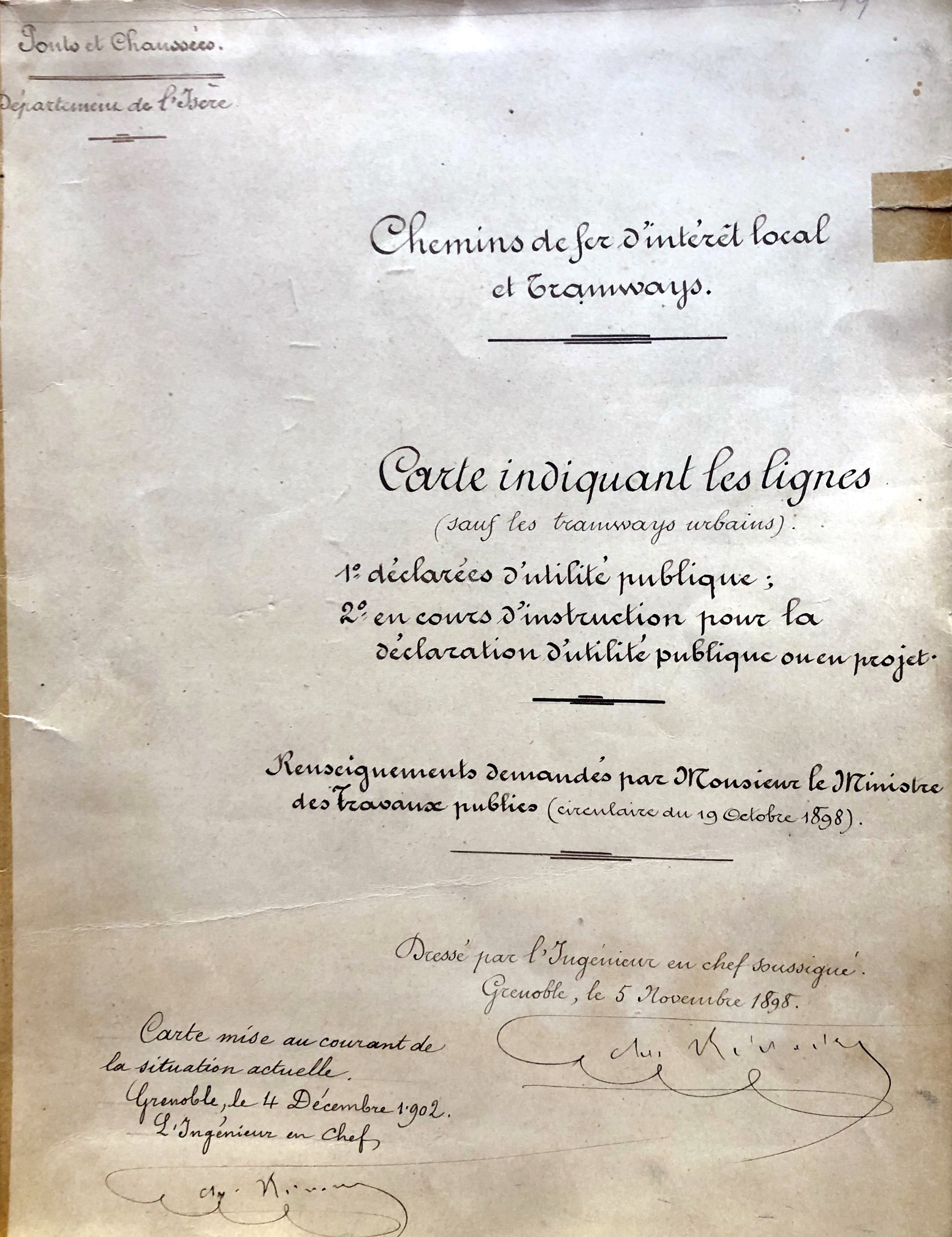 L’apercu ci-dessus n’est qu’un petit extrait de cette carte originale commandée en 1898 par le Ministre des Travaux Publics. Rédigée par l’ingénieur en chef des Travaux Publics de l’isère, il s’agit de l’inventaire des lignes de chemins de fer du département.
