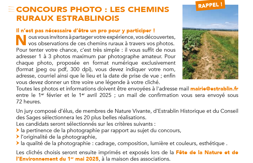 Alors n’hésitez pas à participer au concours photos organisé à cette occasion. Ci-dessous les régles de ce jeu, telles que publiées dans Estrabl’infos.
