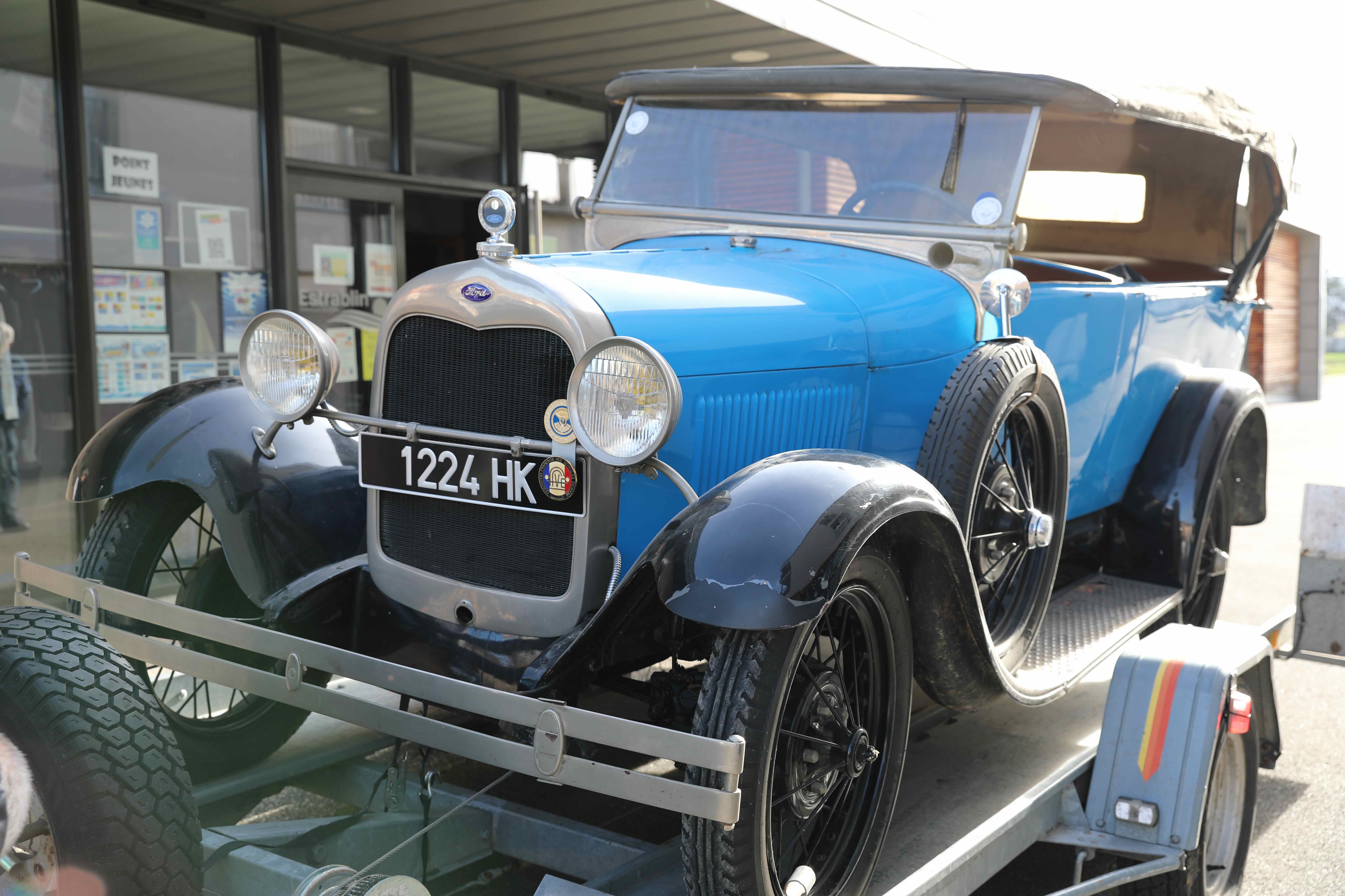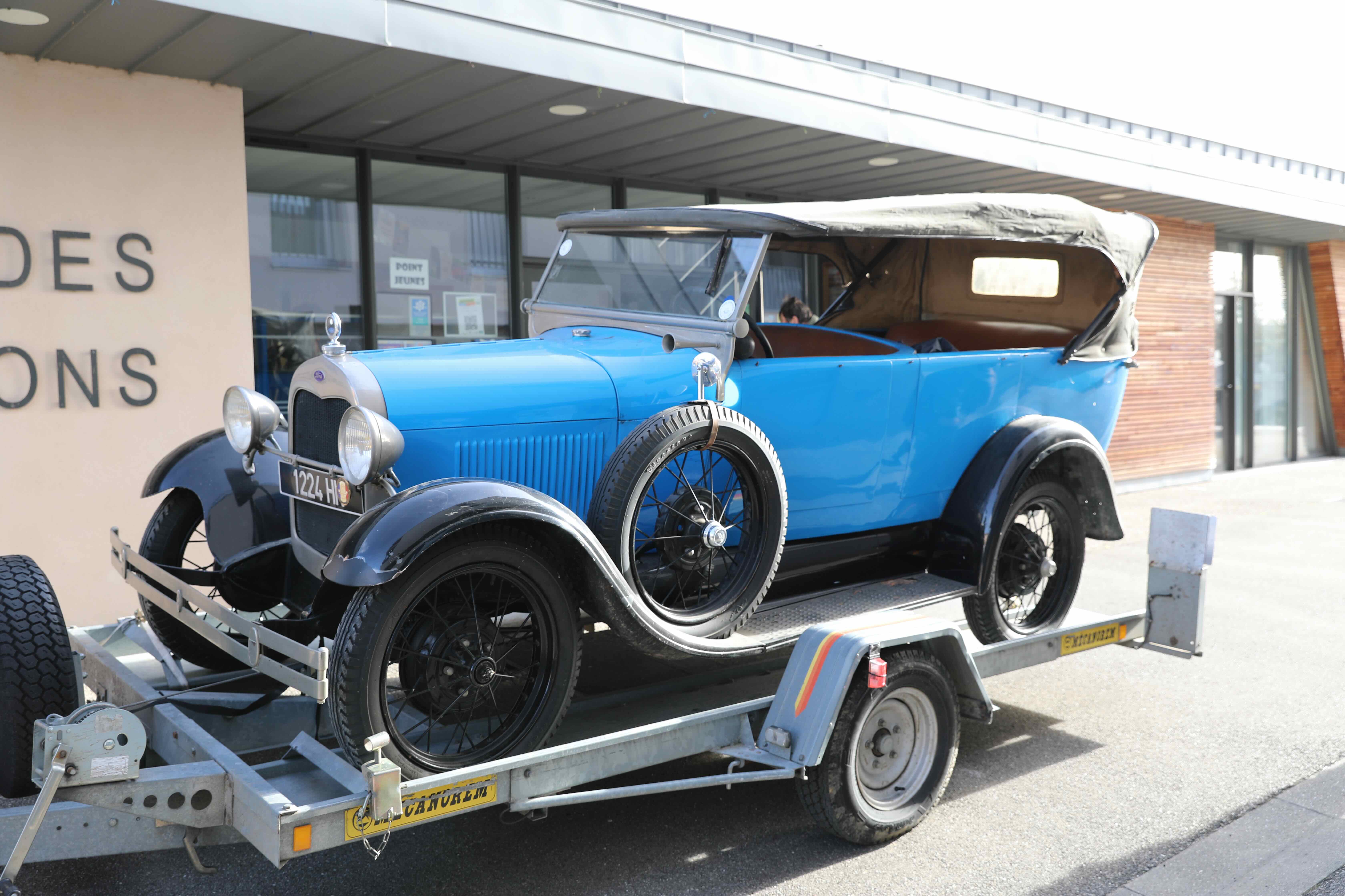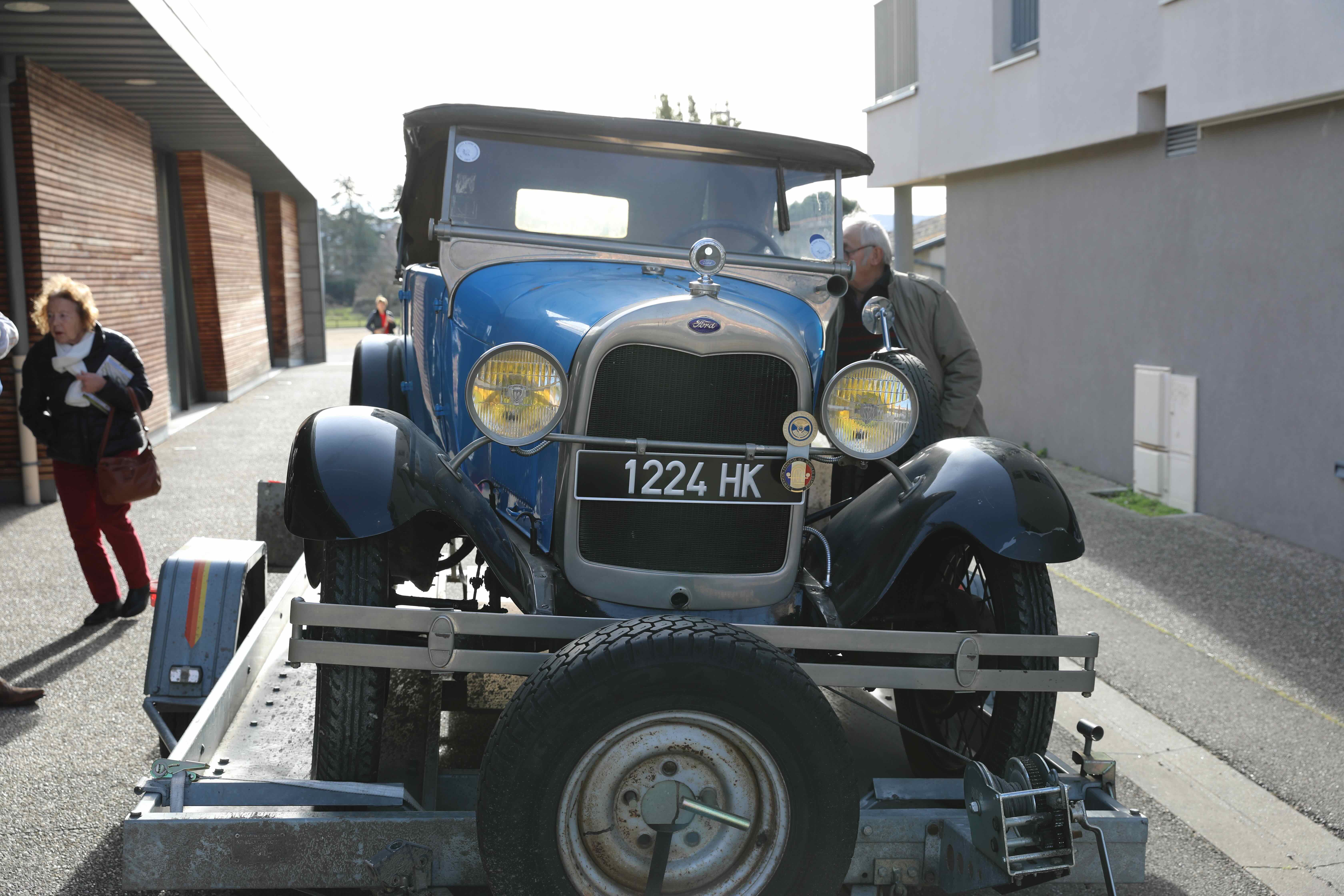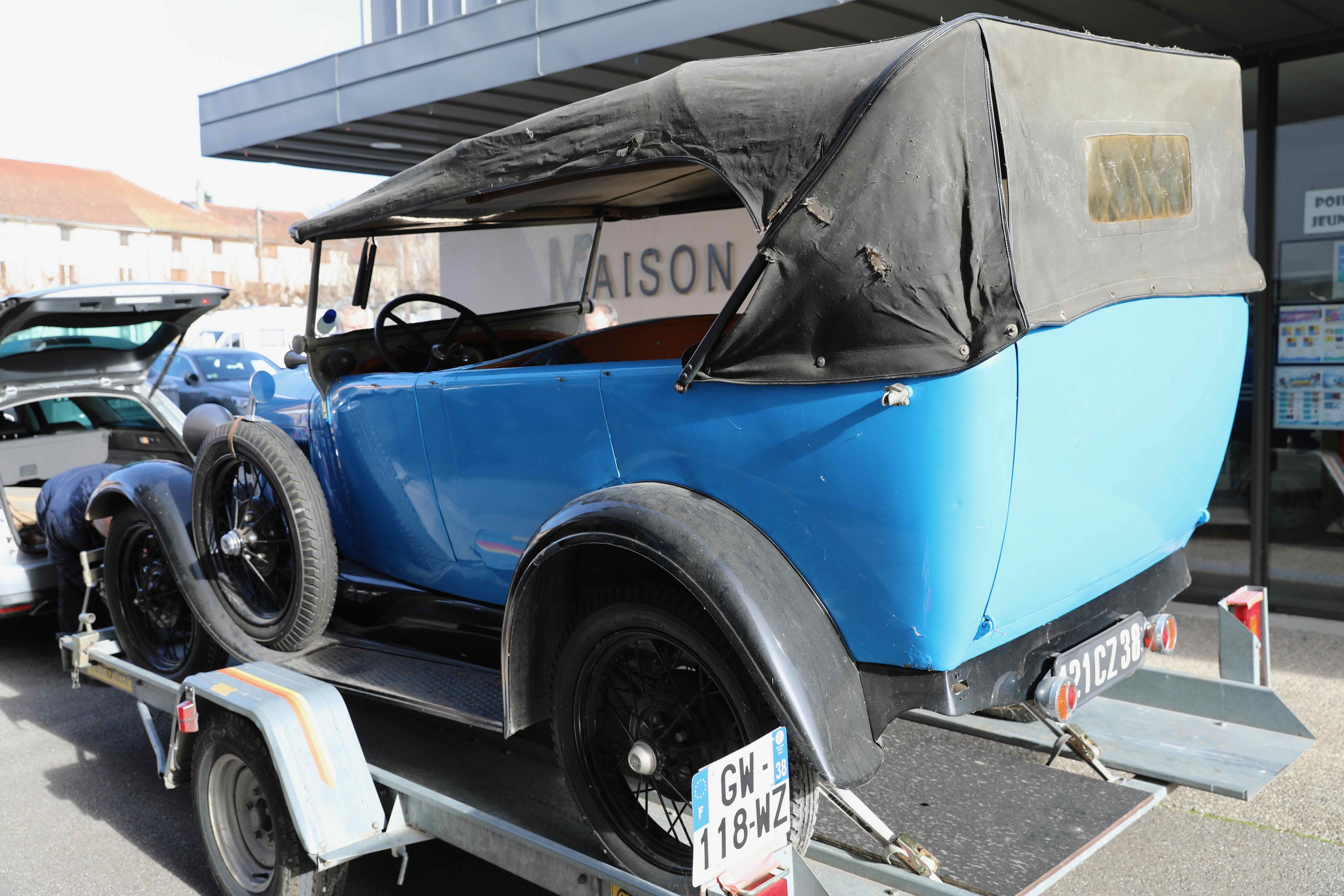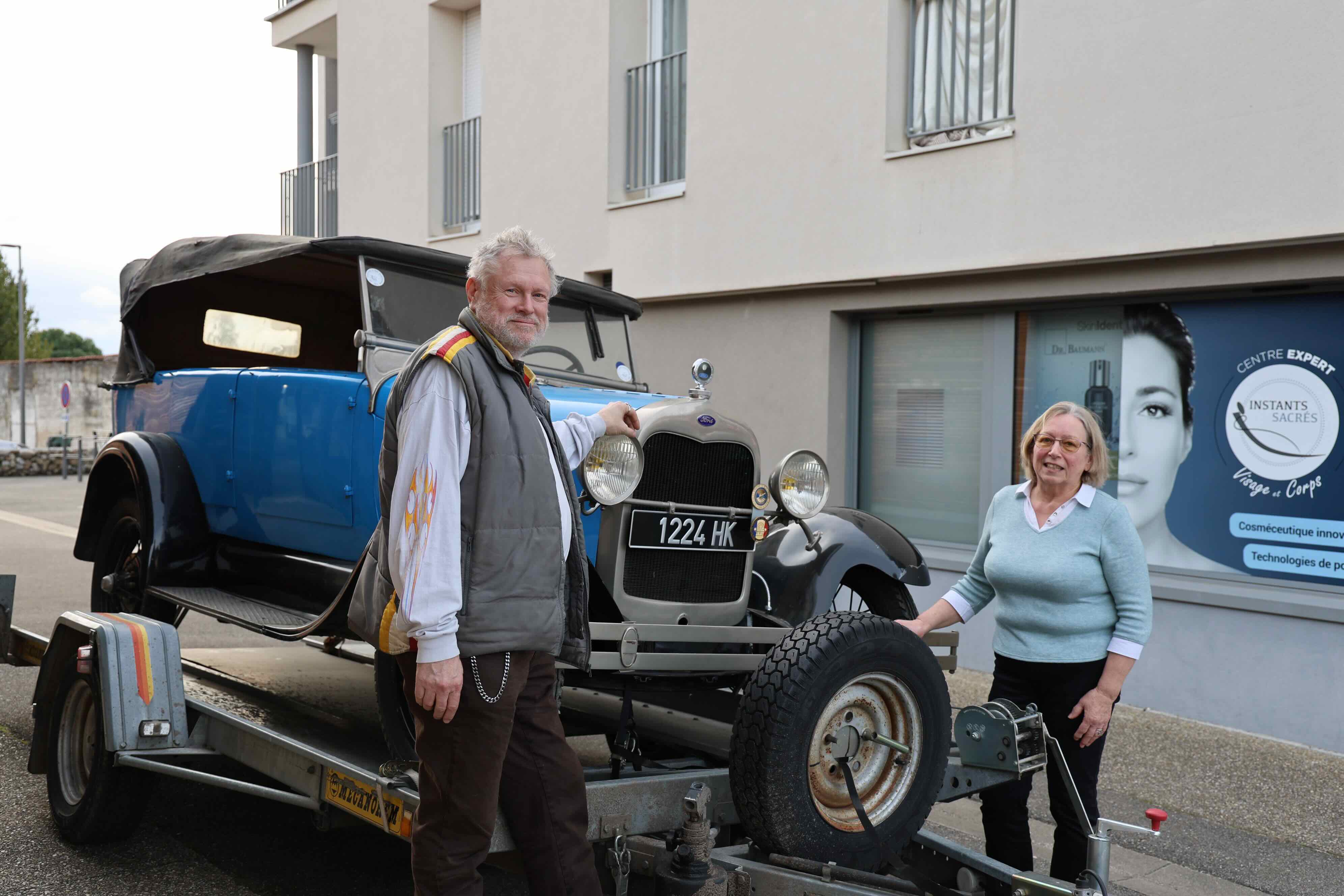 Le propriétaire de la Ford en compagnie de Josette Rostaing, petite fille du premier propriétaire de la voiture