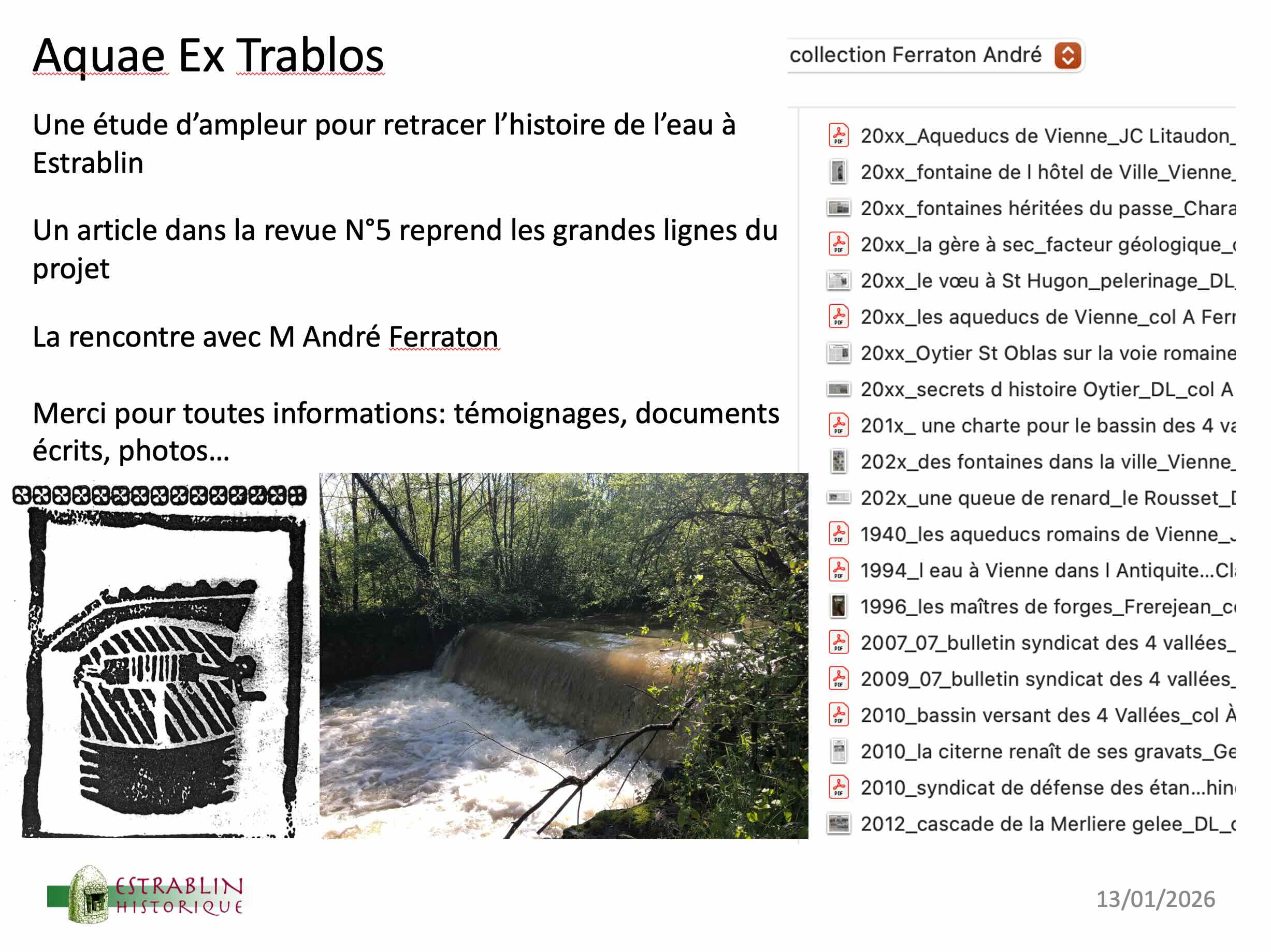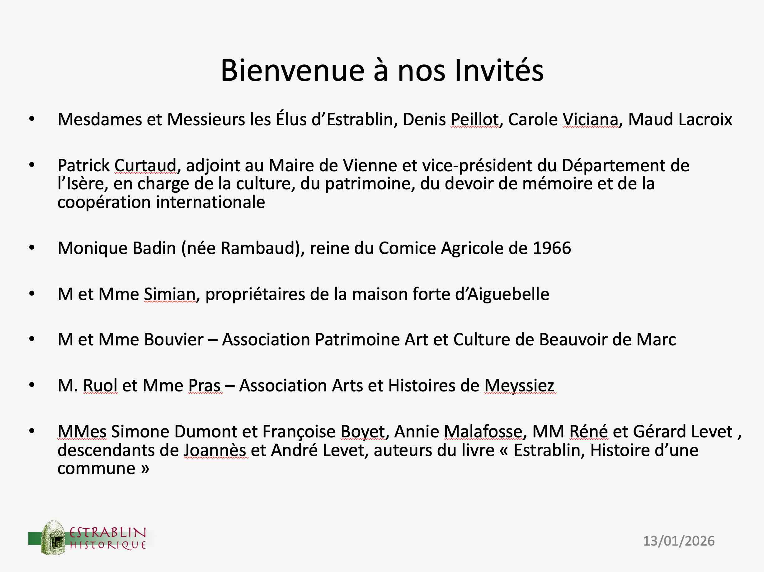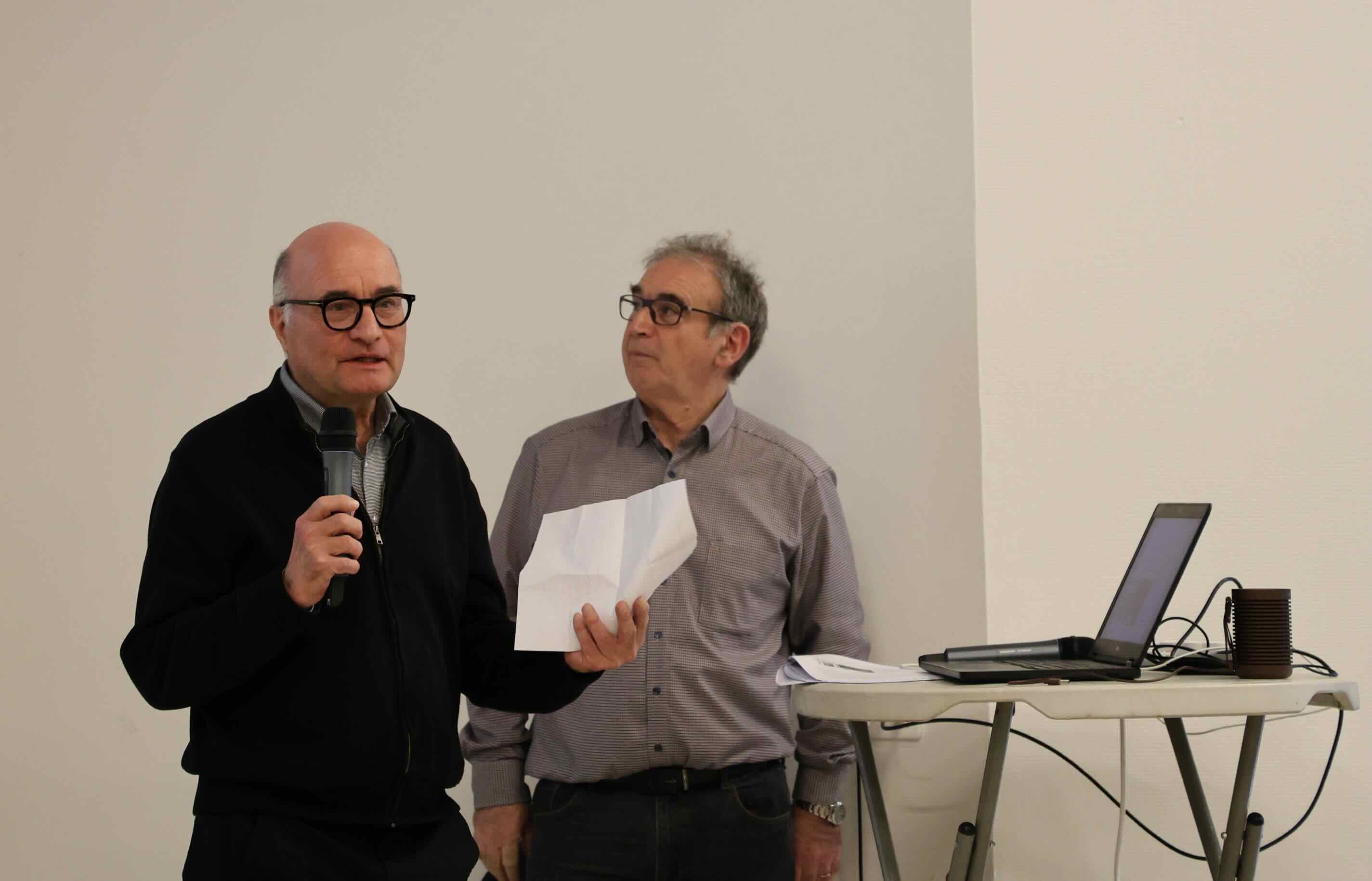 Près de 150 personnes ont assisté à cette réunion. Outre la remise de la revue N°5/2026 aux membres de l’association (les absents la recevront d’ici la fin du mois de janvier), c’était l’occasion de présenter les travaux en cours, les projets, mais aussi de remercier les nombreux donateurs, et en particulier les descendants de Joannès et André Levet, qui remettaient à Roger Ragot un nouveau lot d’archives de ces historiens d’Estrablin.