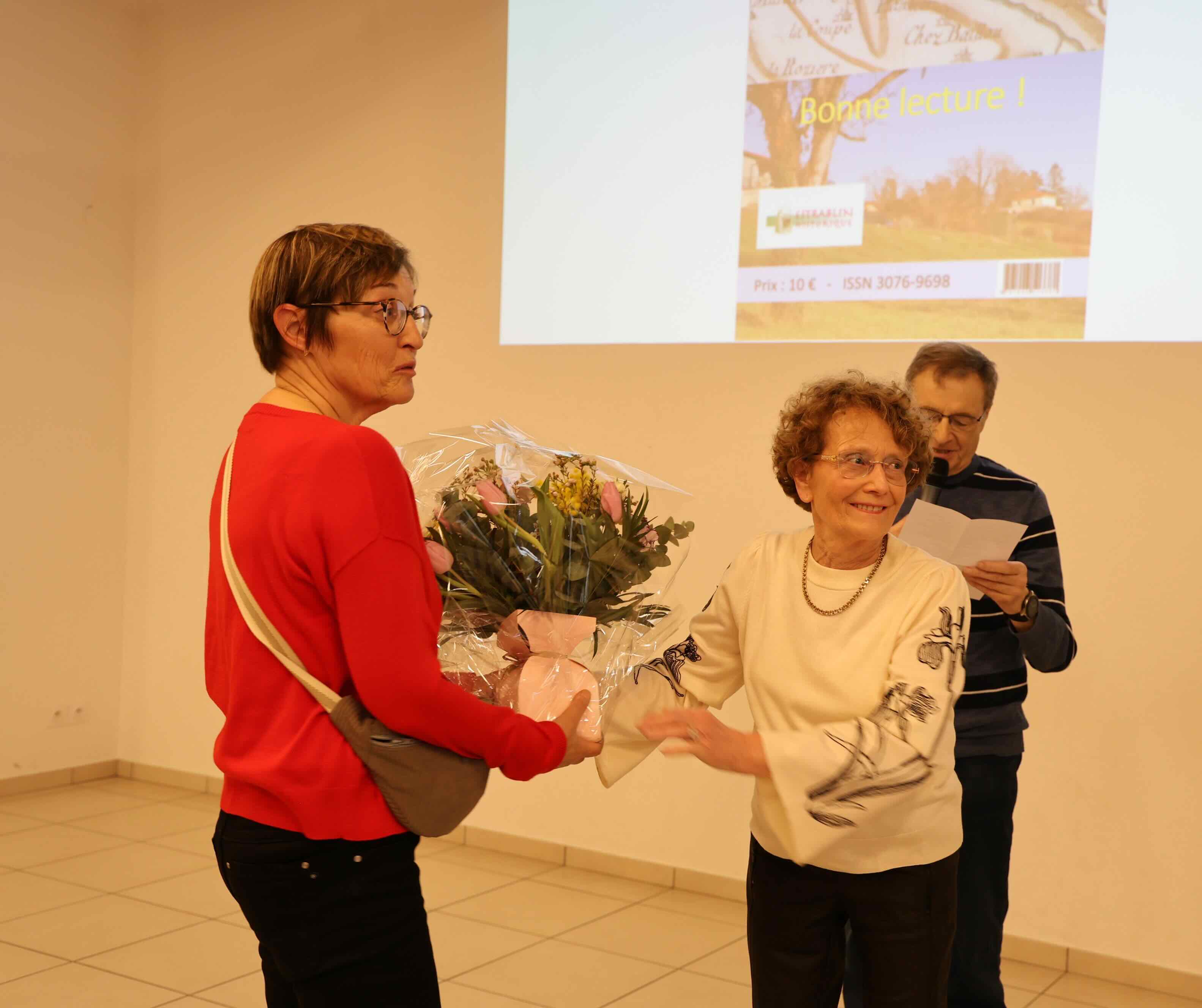 Bernadette, son épouse reçoit un bouquet de fleurs de la part de Jacqueline Bourguignon, trésorière de l’association
