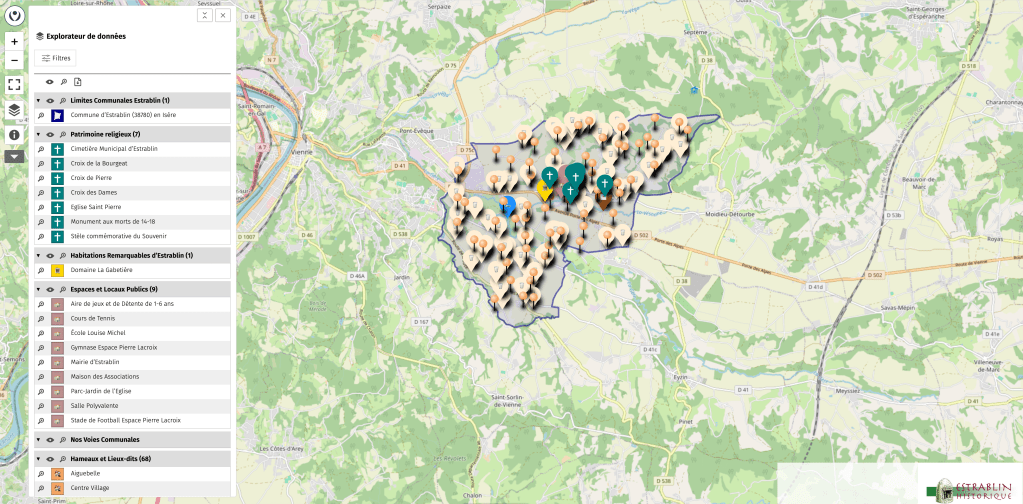 carte de Estrablin Historique pour visualiser la localisation des points concernant le patrimoine historique de notre commune (réalisée sur OpenStreetMap). Vous arrivez sur la carte globale des données renseignées sur la commune par Estrablin Historique. Pour « éclaircir » votre recherche, vous pouvez occulter les chapitres inutiles en cliquant sur « l’oeil » figurant en face de la tête de chapitre à effacer.